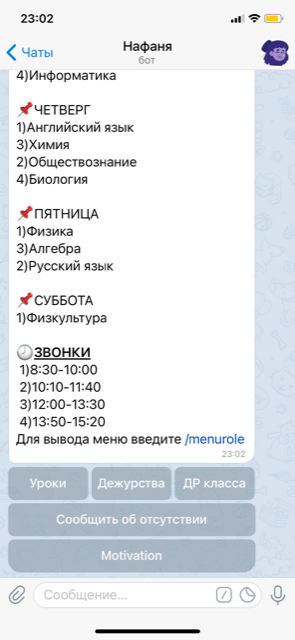 Теперь, воспользовавшись нашим ботом, вы можете узнать расписание уроков, кто сегодня дежурный, узнать, у кого скоро день рождения, или уведомить преподавателя о своем отсутствии.